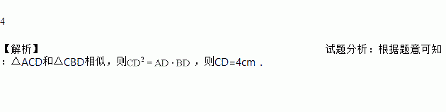 如图,在△ABC中,∠ACB=90°,CD⊥AB,点D为垂足,AD=2 cm,DB=8 cm,则CD=____cm.