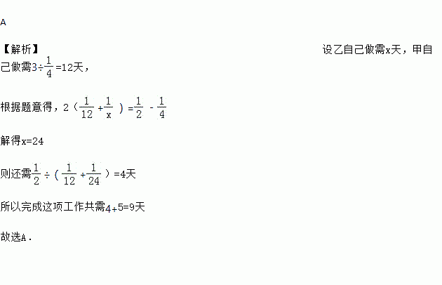 A 【解析】设乙自己做需x天,甲自己做需3÷=12天, 根据题意得,2(+)=﹣ 解得x=24 则还需÷(+)=4天 所以完成这项工作共需4+5=9天 故选A.