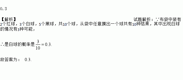0.3 【解析】试题解析:∵布袋中装有2个红球,3个白球,5个黑球,共10个球,从袋中任意摸出一个球共有10种结果,其中出现白球的情况有3种可能, ∴是白球的概率是 故答案为: