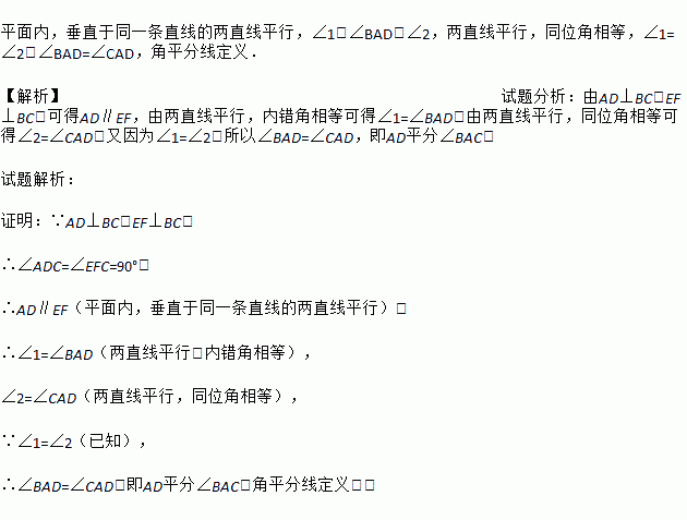 已知:如 图,AD⊥BC于点D,EF⊥BC于点F,交AB于点G,交CA的延长线于点E,∠1=∠2.