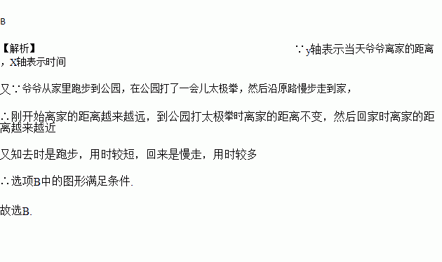 小张的爷爷每天坚持体育锻炼,星期天爷爷从家里跑步到公园,打了一会儿太极拳,然后沿原路慢步走到家,下面能反映当天爷爷离家的距离y(米)与时间x(分钟)之间关系的大致图象是( )