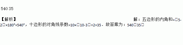 540 35 【解析】【解析】 五边形的内角和=(5-2)×180°=540°,十边形的对角线条数=10×(10-3)÷2=35.故答案为:540;35.