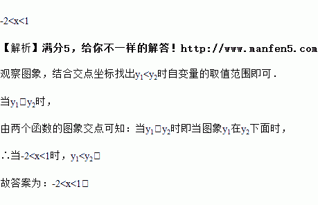 如图,抛物线和直线相交于点(-2,0)和(1,3),则当y1〈y2,时,的取值范围是________.