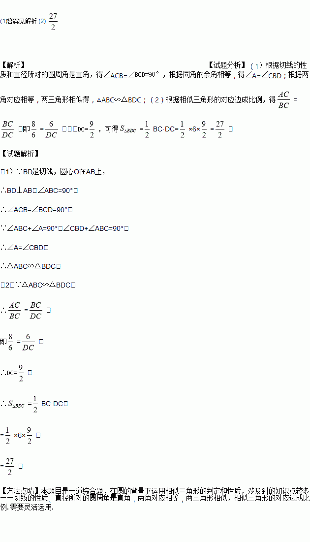 如图,⊙O是△ABC的外接圆,圆心O在AB上,过点B作⊙O的切线交AC的延长线于点D。