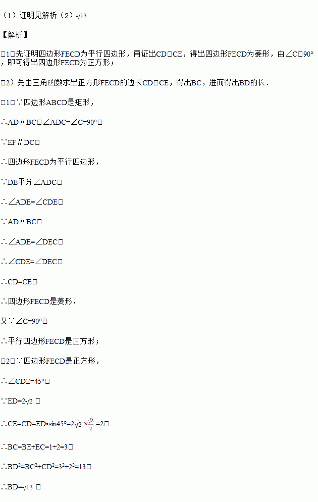 已知:如图,在矩形ABCD中,E是BC边一点,DE平分∠ADC,EF∥DC角AD边于点F,连结BD.