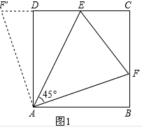 ·ÖÎö £¨1£©ÑÓ³¤EDF¡ä£¬Ê¹DF¡ä=BF£¬ÓÉABCDΪÕý·½ÐΣ¬¸ù¾ÝÕý·½ÐεÄËÄÌõ±ßÏàµÈµÃµ½AB=AD£¬¡ÏABF=¡ÏADF¡ä=90¡ã£¬ÀûÓÃSAS¿ÉµÃ³öÈý½ÇÐÎABFÓëÈý½ÇÐÎADF¡äÈ«µÈ£¬¸ù¾ÝÈ«µÈÈý½ÇÐεÄÐÔÖʵõ½AF=AF¡ä£¬¡ÏBAF=¡ÏDAF¡ä£¬ÓÉ¡ÏEAFΪ45¡ã£¬µÃµ½¡ÏDAE+¡ÏFAB=45¡ã£¬µÈÁ¿´ú»»¿ÉµÃ³ö¡ÏEAF¡ä=45¡ã£¬È»ºóÀûÓÃSASµÃµ½Èý½ÇÐÎAEFÓëÈý½ÇÐÎAEF¡ä£¬ÀûÓÃÈ«µÈÈý½ÇÐεĶÔÓ¦±ßÏàµÈµÃµ½EF=EF¡ä£¬¶øEF¡ä=ED+DF¡ä£¬ÔÙ½«DF¡ä»»ÎªBF¼´¿ÉµÃÖ¤£»