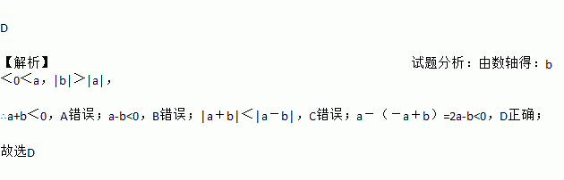 D 【解析】试题分析:由数轴得:b<0<a,|b|>|a|, ∴a+b<0,A错误;a-b<0,B错误;│a+b│<│a-b│,C错误;a-(-a+b)=2a-b<0,D正确; 故选D