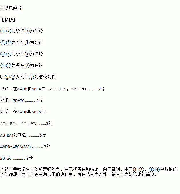 如图,给出五个等量关系:①AD=BC ②AC=BD ③CE=DE ④∠D=∠C ⑤∠DAB=∠CBA.请你以其中两个为条件,另三个中的一个为结论,推出一个正确的结论(只需写出一种情况),并加以证明.