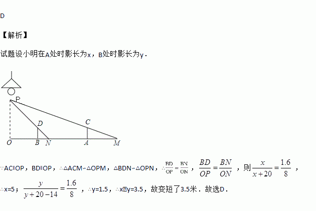 如图,路灯距地面8米,身高1.6米的小明从距离灯的底部(点O)20米的点A处,沿OA所在的直线行走14米到点B时,人影的长度( )