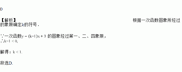 若一次函数y=(k-1)x+3的图象经过第一、二、四象限,则k的取值范围是( )