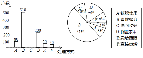 ④家庭过期药品的正确处理方式是送回收点,若该市有180万户家庭,请估计大约有多少户家庭处理过期药品的方式是送回收点.