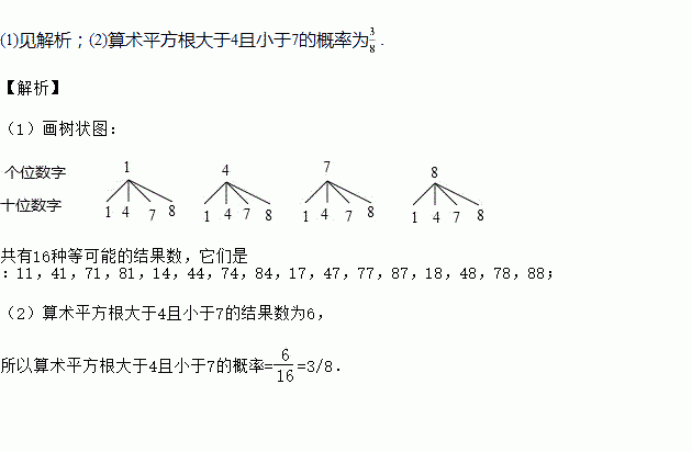 一袋中装有形状大小都相同的四个小球,每个小球上各标有一个数字,分别是1,4,7,8.现规定从袋中任取一个小球,对应的数字作为一个两位数的个位数;然后将小球放回袋中并搅拌均匀,再任取一个小球,对应的数字作为这个两位数的十位数.