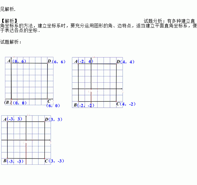 建立两个适当的平面直角坐标系,分别画出边长为6的正方形ABCD,并标出每个顶点坐标.