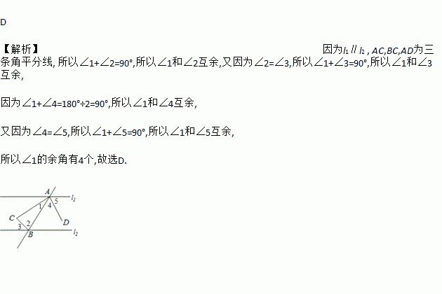 D 【解析】因为l1∥l2 , AC,BC,AD为三条角平分线, 所以∠1+∠2=90°,所以∠1和∠2互余,又因为∠2=∠3,所以∠1+∠3=90°,所以∠1和∠3互余, 因为∠1+∠4=180°÷2=90°,所以∠1和∠4互余, 又因为∠4=∠5,所以∠1+∠5=90°,所以∠1和∠5互余, 所以∠1的余角有4个,故选D.