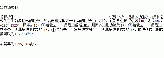 一个多边形截去一个角后,所形成的一个新多边形的内角和为2520°,则原多边形有________条边。