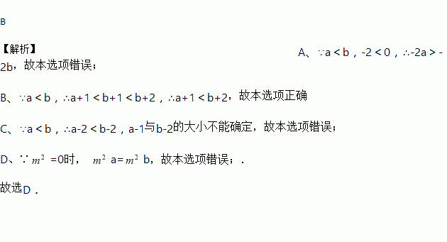 A. ﹣2a<﹣2b B. a+1<b+2 C. a﹣1<b﹣2 D. m2a<m2b