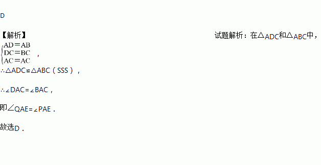 如图,小明做了一个角平分仪ABCD,其中AB=AD,BC=DC.将仪器上的点A与∠PRQ的顶点R重合,调整AB和AD,使它们分别落在角的两边上,过点A,C画一条射线AE,AE就是∠PRQ的平分线.此角平分仪的画图原理是:根据仪器结构,可得△ABC≌△ADC,这样就有∠QAE=∠PAE.则说明这两个三角形全等的依据是( )