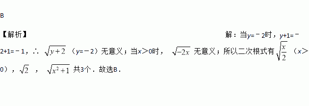 B 【解析】【解析】 当y=﹣2时,y+1=﹣2+1=﹣1,∴ (y=-2)无意义;当x>0时, 无意义;所以二次根式有(x>0), , 共3个.故选B.