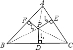 如图所示.P为△ABC内任意一点,三边a,b,c的高分别为ha,hb,hc,且P到a,b,c的距离分别为ta,tb,tc.求证:
