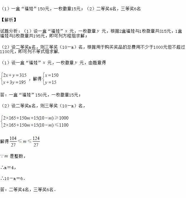 (1)求一盒“福娃”和一枚徽章各多少元?