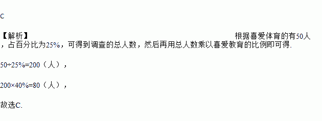 某校随机调查了学生对“新闻、体育、动画、教育”四类电视节目最喜爱的情况并绘制成如图所示的扇形统计图,若最喜爱体育的有50人,则最喜爱教育的人数为( )