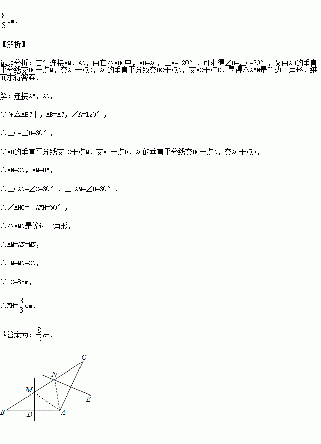 (2014秋•安阳县校级期末)如图,在△ABC中,AB=AC,∠A=120°,BC=8cm,AB的垂直平分线交BC于点M,交AB于点D,AC的垂直平分线交BC于点N,交AC于点E,则MN的长为 .