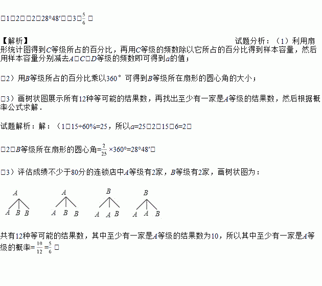 今年10月,某公司随机抽取所属的a家连锁店进行评估,将各连锁店按照评估成绩分成了A、B、C、D四个等级,绘制了如图尚不完整的统计图表.