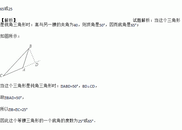 65或25 【解析】试题解析:当这个三角形是锐角三角形时:高与另一腰的夹角为40,则顶角是50°,因而底角是65°; 如图所示: 当这个三角形是钝角三角形时:∠ABD=50°,BD⊥CD, 故∠BAD=50°, 所以∠B=∠C=25° 因此这个等腰三角形的一个底角的度数为25°或65°.