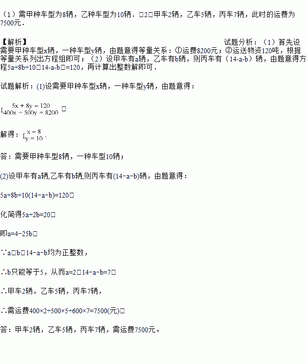 (1)若全部物资都用甲、乙两种车型来运送,需运费8200元,问分别需甲、乙两种车型各几辆?