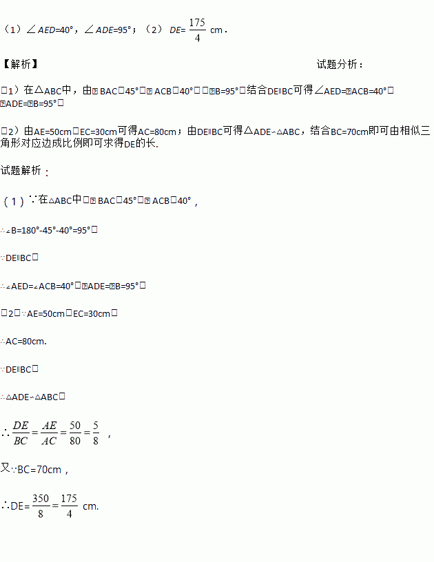 (1)∠ AED=40°,∠ ADE=95°;(2) DE= cm. 【解析】试题分析: (1)在△ABC中,由∠ BAC=45°,∠ ACB=40°易得∠B=95°,结合DE∥BC可得∠AED=∠ACB=40°,∠ADE=∠B=95°; (2)由AE=50cm,EC=30cm可得AC=80cm;由DE∥BC可得△ADE∽△ABC,结合BC=70cm即可由相似三角形对应边成比例即...