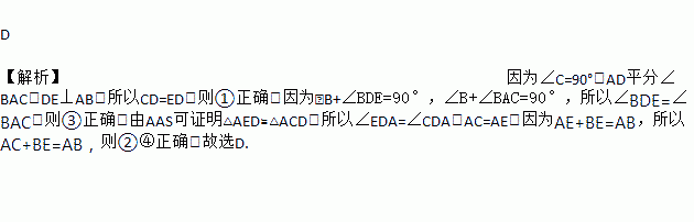 如图,在△ABC中,∠C=90°,AD平分∠BAC,DE⊥AB于E,有下列结论:①CD=ED;②AC+BE=AB;③∠BDE=∠BAC;④AD平分∠CDE;其中正确的是( )个.