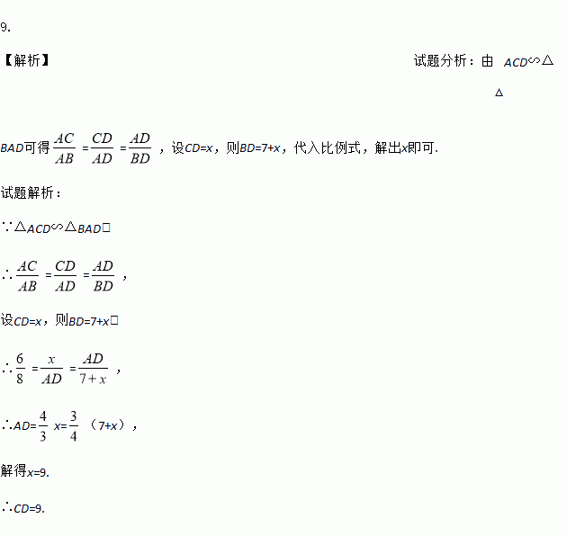如图27?11,在△ABC中,AB=8,AC=6,BC=7,点D在BC的延长线上,且△ACD∽△BAD,求CD的长.