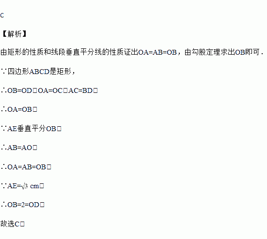 如图,在矩形ABCD中,对角线AC,BD相交于点O,AE垂直平分BO,AE=cm,则OD=( )