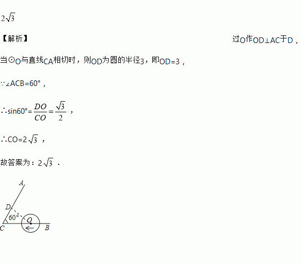 如图,∠ACB=60°,⊙O的圆心O在边BC上,⊙O的半径为3,在圆心O向点C运动的过程中,当CO= ________时,⊙O与直线CA相切.