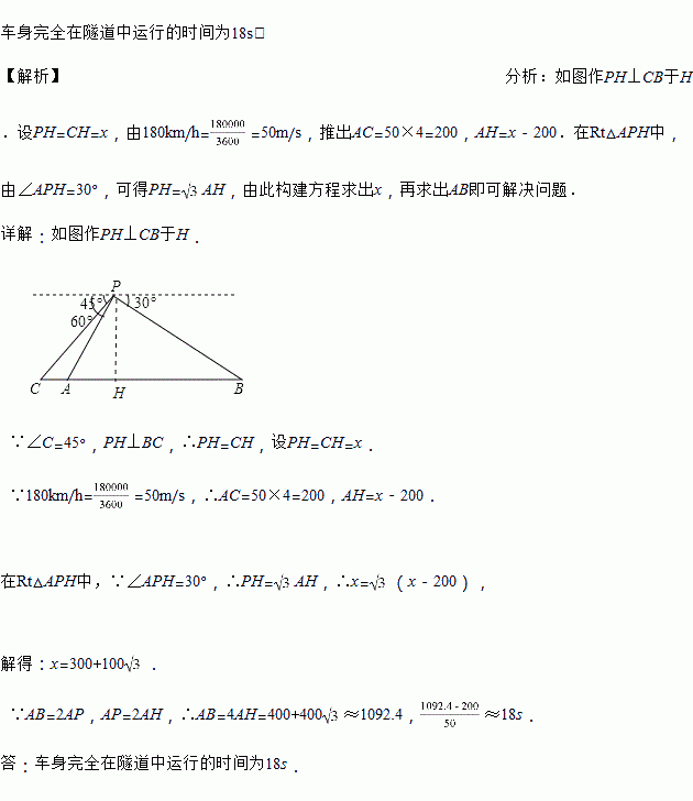 宜万铁路线上,一列列和谐号动车象一条条巨龙穿梭于恩施崇山峻岭,大多地段桥梁与隧道交替相连如图,勘测队员在山顶P处测得山脚下隧道入口A点处的俯角为60°,隧道出口B点处的俯角为30°,一列动车以180km/h的速度自西向东行驶,当车头抵达入口A点处时,车尾C点处的俯角是45°,整个车身全部进入隧洞恰好用了4s钟时间,求车身完全在隧道中运行的时间(结果精确到1秒,参考数据: