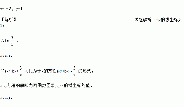 如图,已知函数y=与y=ax2+bx+c(a>0,b>0)的图象相交于点P,且点P的纵坐标为1,则关于x的方程ax2+bx+=0的解是________