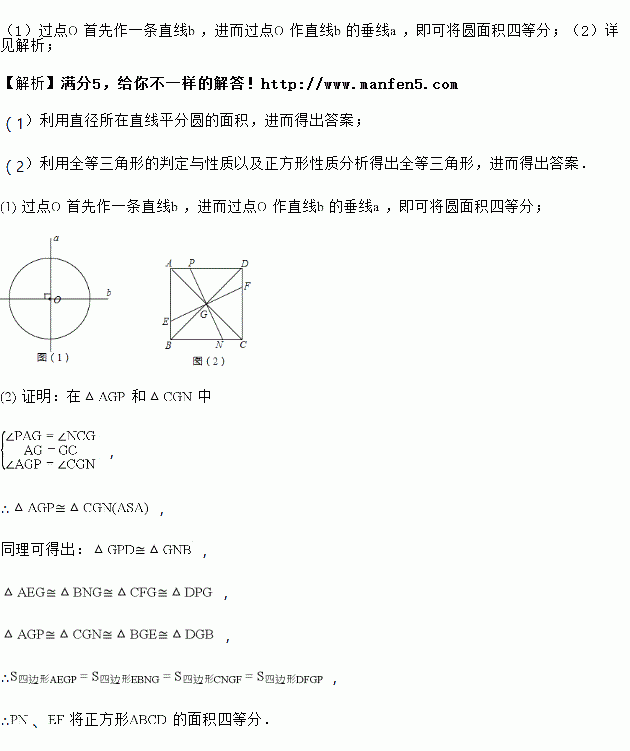 中作出两条直线,使它们将圆面积四等分,并写出作图过程;![]()