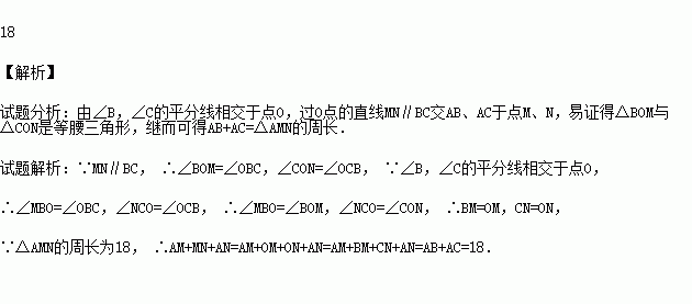 已知:如图所示,△AMN的周长为18,∠B,∠C的平分线相交于点O,过O点的直线MN∥BC交AB、AC于点M、N.则AB+AC= .