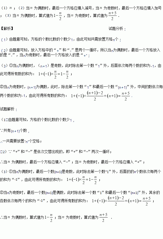 (2)如果第一个方格填入加号“+”,第二个方格填入减号“—”,第三个方格填入加号“+”, 第四个方格填入减号“—”,…,按此规律轮流将加、减号从左向右依次填入方格中,问最后一个方格应填入什么符号?