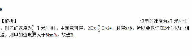甲、乙两人从相距24km的A、B两地沿着同一条公路相向而行,如果甲的速度是乙的速度的两倍,如果要保证在2小时以内相遇,则甲的速度( )