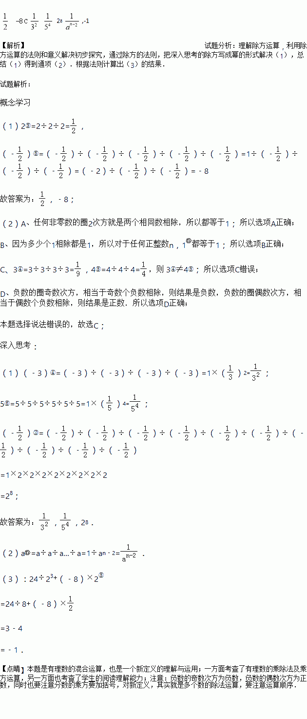 规定:求若干个相同的有理数(均不等于0)的除法运算叫做除方,如2÷2÷2,(﹣3)÷(﹣3)÷(﹣3)÷(﹣3)等.类比有理数的乘方,我们把2÷2÷2记作2③,读作“2的圈3次方”,(﹣3)÷(﹣3)÷(﹣3)÷(﹣3)记作(﹣3)④,读作“﹣3的圈4次方”,一般地,把