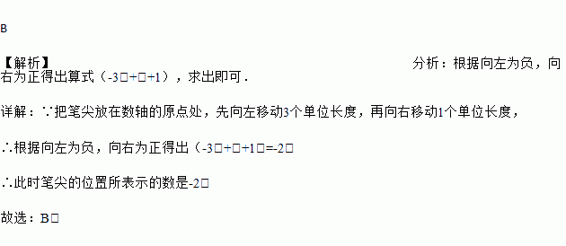 在“有理数的加法与减法运算”的学习过程中,我们做过如下数学实验.“把笔尖放在数轴的原点处,先向左移动3个单位长度,再向右移动1个单位长度,这时笔尖的位置表示什么数?”用算式表示以上过程和结果的是( )
