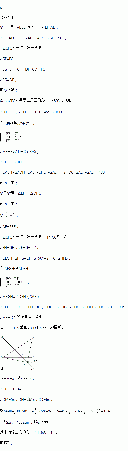 如图,在正方形ABCD中,AC为对角线,E为AB上一点,过点E作EF∥AD,与AC,DC分别交于点G,F,H为CG的中点,连接DE,EH,DH,FH.下列结论中结论正确的有( )