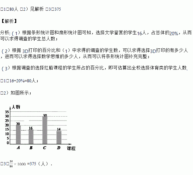 为深化课改,落实立德树人目标,某学校设置了以下四门拓展性课程:A.数学思维,B.文学鉴赏,C.红船课程,D.3D打印,规定每位学生选报一门.为了解学生的报名情况,随机抽取了部分学生进行调查,并制作成如下两幅不完整的统计图,请回答下列问题: