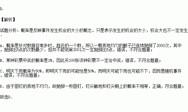 D.抛掷一枚图钉,钉尖触地和钉尖朝上的概率不相等。
