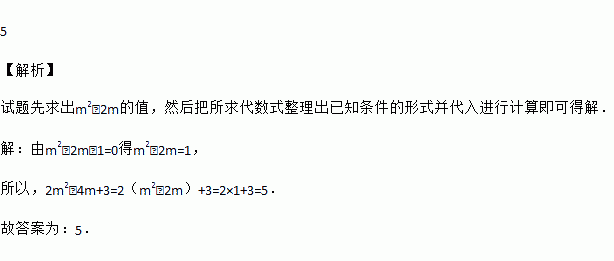 若m2﹣2m﹣1=0,则代数式2m2﹣4m+3的值为 .