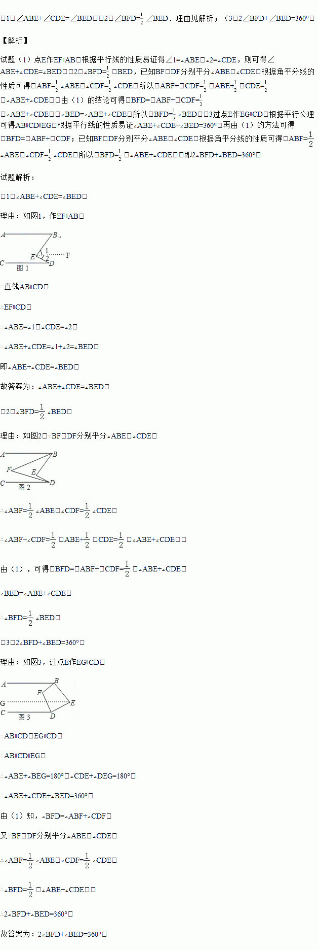 (2)如图2,BF,DF分别平分∠ABE,∠CDE,那么∠BFD和∠BED有怎样的数量关系?请说明理由.