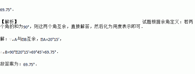 已知∠A与∠B互补,若∠A=20°15′,则∠B的度数为 ______.