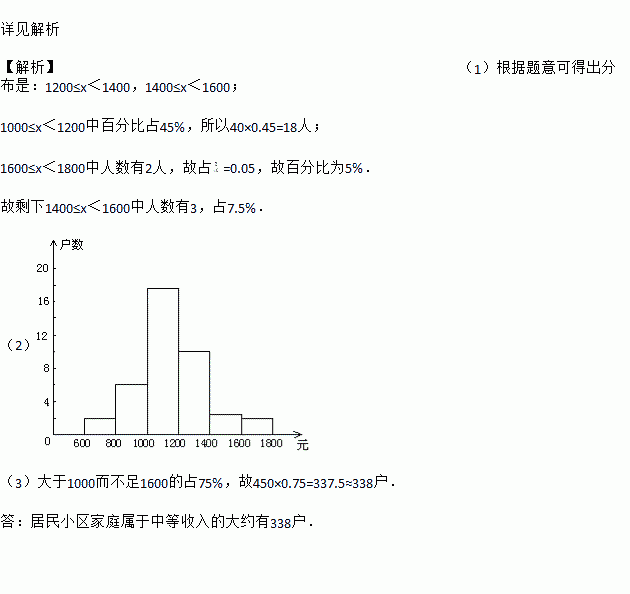 (3)请你估计该居民小区家庭属于中等收入(大于1000不足1600元)的大约有多少户?