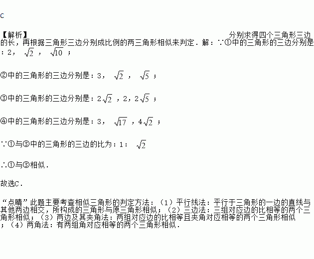 C 【解析】分别求得四个三角形三边的长,再根据三角形三边分别成比例的两三角形相似来判定.【解析】 ∵①中的三角形的三边分别是:2, , ; ②中的三角形的三边分别是:3, , ; ③中的三角形的三边分别是:2,2,2; ④中的三角形的三边分别是:3, ,4; ∵①与③中的三角形的三边的比为:1: ∴①与③相似. 故选C. “点睛”此题主要考查相似三...
